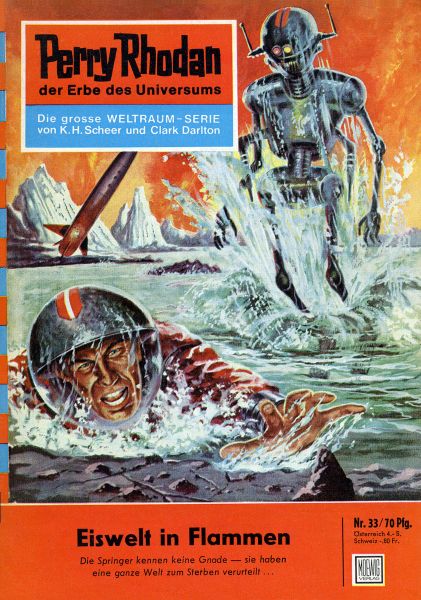 Auseinandersetzungen auf der Erde, Invasionen aus dem All, Raumschlachten, Kämpfe auf fernen Planeten – all das hat die mit Hilfe der uralten arkonidischen Technik begründete Dritte Macht Perry Rhodans in der kurzen Zeit ihrer Existenz schon erfolgreich durchgestanden. Die Springer aber – jene Arkonidenabkömmlinge, die seit acht Jahrtausenden das unbestrittene Handelsmonopol in der Galaxis besitzen, weil sie jede aufkommende Konkurrenz unerbittlich unterdrückten – stellen eine Bedrohung dar, die nicht ernst genug genommen werden kann. Perry Rhodan hat auch bisher alles getan, was in seiner Macht stand, um zu verhindern, aß die Springer aus der Erde eine Kolonie machen. Seine Raumkreuzer flogen Scheinangriffe gegen die versammelte Flotte der Springer, während er selbst mit der STARDUST den Planeten des Unsterblichen aufsuchte, um sich eine neue Waffe gegen die Springer zu beschaffen. Er hat diese neue Waffe bereits einsetzen müssen, und er muß sie wieder einsetzen, weil Patriarch Etztak die EISWELT IN FLAMMEN aufgehen läßt...
