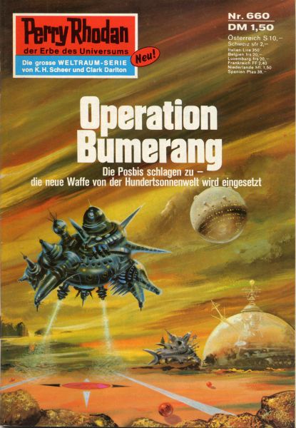 Die Posbis schlagen zu — die neue Waffe von der Hundertsonnenwelt wird eingesetzt Zyklus: Das Konzil Die Hauptpersonen des Romans: Mang Hetely — Verbindungsoffizier auf der Hundertsonnenwelt. Eygel Hoschtra — Ein Physiker erfindet eine neue Waffe. Speech — Ein schizophrener Roboter. Reginald Bull — Der Staatsmarschalt hat einen »Vogel«. Feryn Maytusz — Ein junger Offizier in wichtiger Mission.