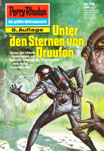 Harno, das lebende Fernsehgerät, und Onot, der Geist aus der Vergangenheit — zwei Helfer in höchster Not! Zyklus: Atlan und Arkon Die Hauptpersonen des Romans: Perry Rhodan — Administrator des Solaren Imperiums. Reginald Bull — Er macht sich Sorgen um seinen kleinen Freund. Colonel Markus Everson — Kommandant der KUBLAI KHAN. Harno — Ein lebendes Fernsehgerät. Gucky — Der Mausbiber „spielt" mit dem „Zeiterstarrer". Atlan — Man kann es dem Arkoniden, der vor 10 000 Jahren gegen die Druuf gekämpft hatte, nicht verdenken, wenn er Perry Rhodans Bündnisplänen skeptisch gegenübersteht. Tommy-1 — Unterhändler des Rates der Sechsundsechzig. Onot — Ein Druuf-Wissenschaftler, der behauptet, Perry Rhodan von früher zu kennen.